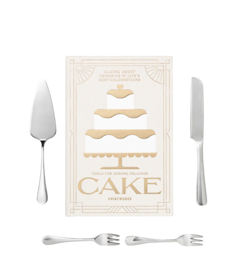 Kit per torte, splendidamente presentato in un’elegante scatola a forma di libro. Incluso nel kit: 1 Spatola per torte. 1 Coltello per torte. 6 Forchette da Dessert.