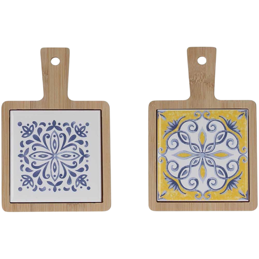 Il Set 2 taglieri è realizzato in bambù e ceramica. Le decorazioni della ceramica richiamano le tipiche piastrelle ornamentali siciliane nei toni del blu e del giallo.