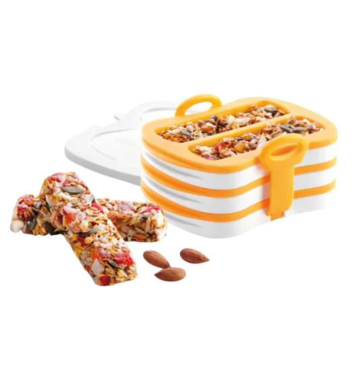 Cosa c’è di più sano di uno snack preparato in casa, meglio ancora se è una barretta a base di cereali, miele e frutta secca? Grazie agli stampi con pressa, potrai prepararne quante ne vorrai grazie al ricettario incluso: alla frutta, al cioccolato, al caffè. Le barrette si sformano senza fatica dagli stampi morbidi in silicone.