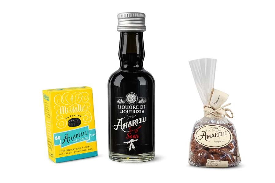 La box Amarelli è costituita da: Bottiglia di birra chiara artigianale alla liquirizia. – Sacchetto mandorle tostate con polvere di liquirizia e sale. – Scatola da 60 gr. di morette al limone (liquirizia gommosa).