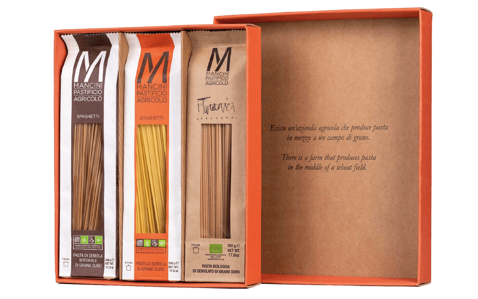 Mancini pastificio agricolo coltiva direttamente nei campi nel cuore delle Marche. Il set 3 linee contiene: 1 busta da 500gr di spaghetti per ciascuna delle 3 linee pasta Mancini; 1 busta da 500 g di spaghetti linea classica; n1 busta da 500g di spaghetti linea integrale; 1 busta di spaghetti linea grani turanici.
